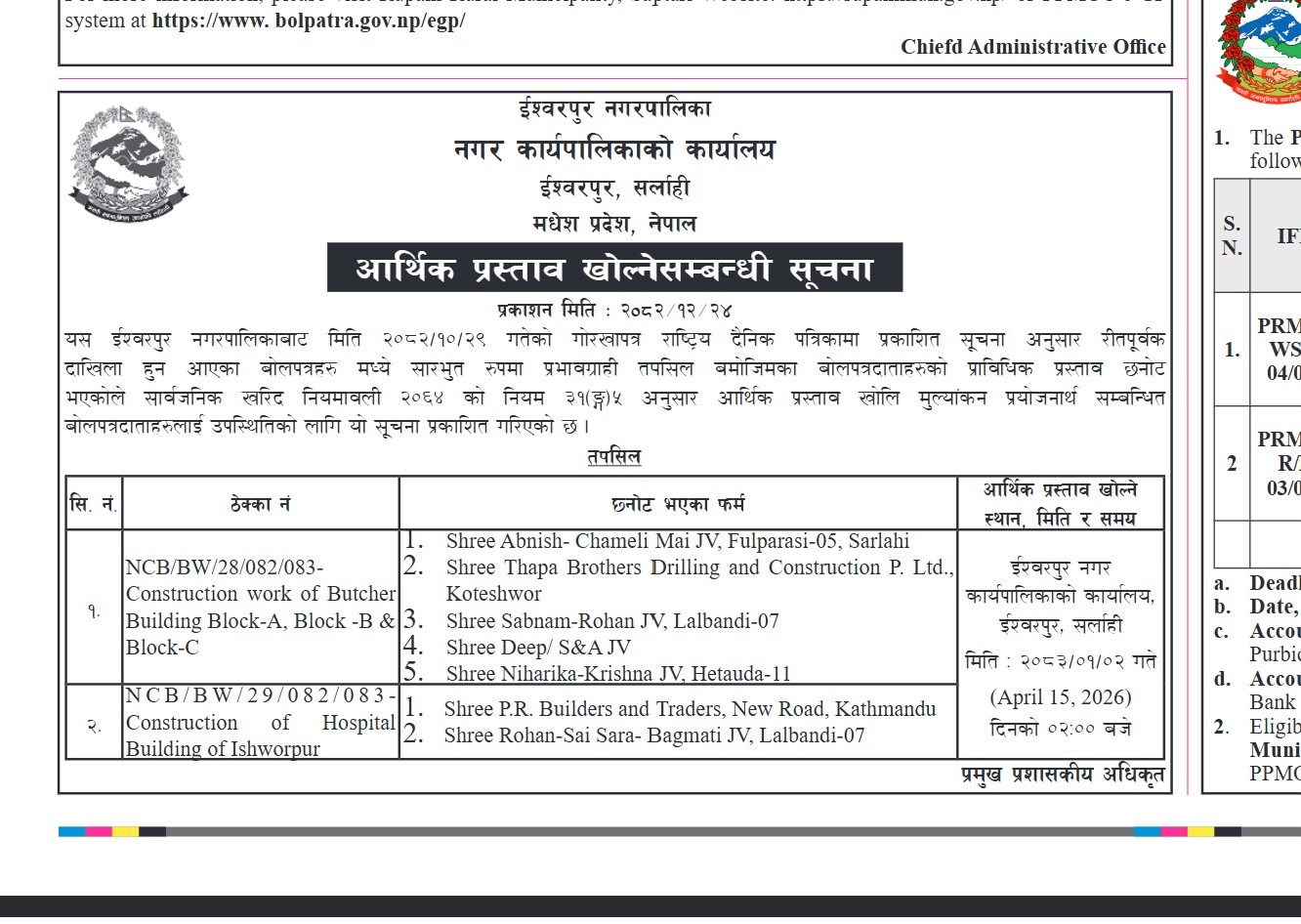आर्थिक प्रस्ताव खोल्ने सम्बन्धी सूचना