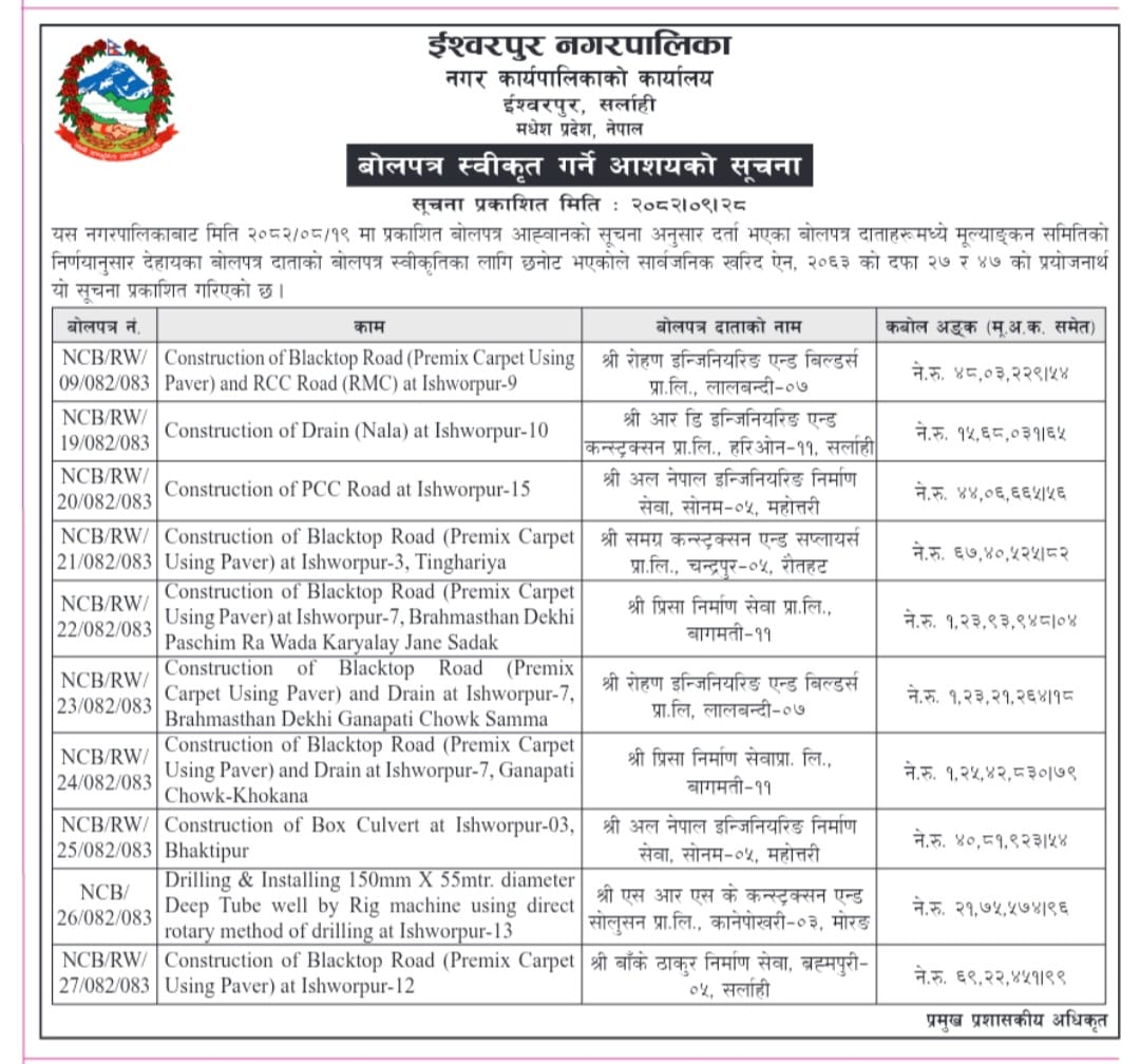 » बोलपत्र स्वीकृत गर्ने आशयको सूचना