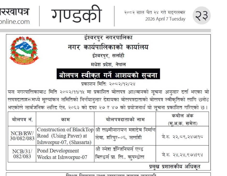 बोलपत्र स्वीकृत गर्ने आशयको सूचना