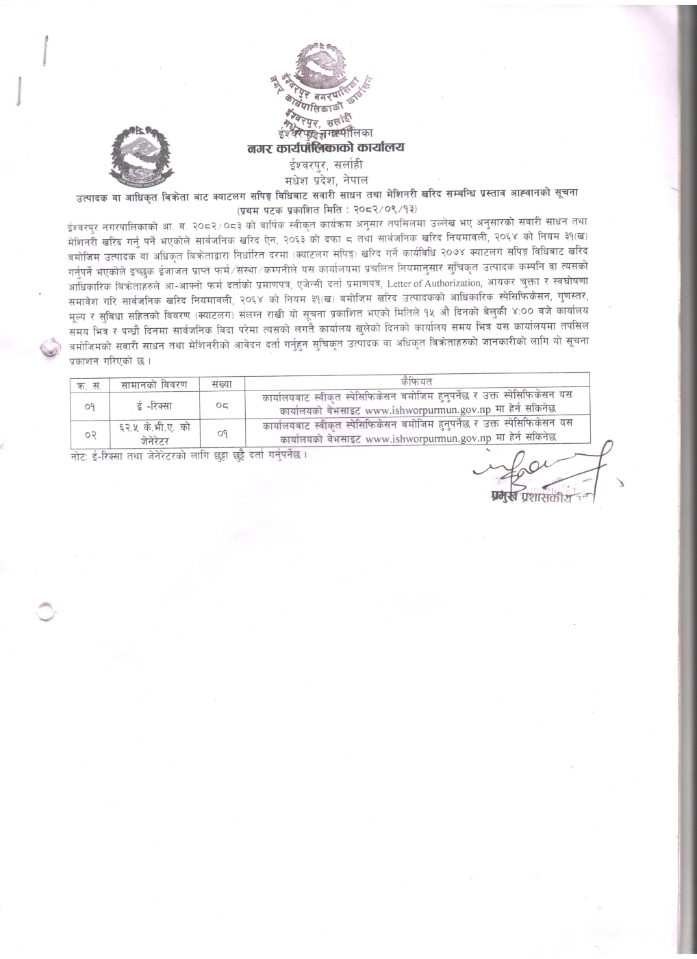 सवारी साधन तथा मेसिनरी खरीद सम्बन्धी प्रस्ताव आहवानको सूचना