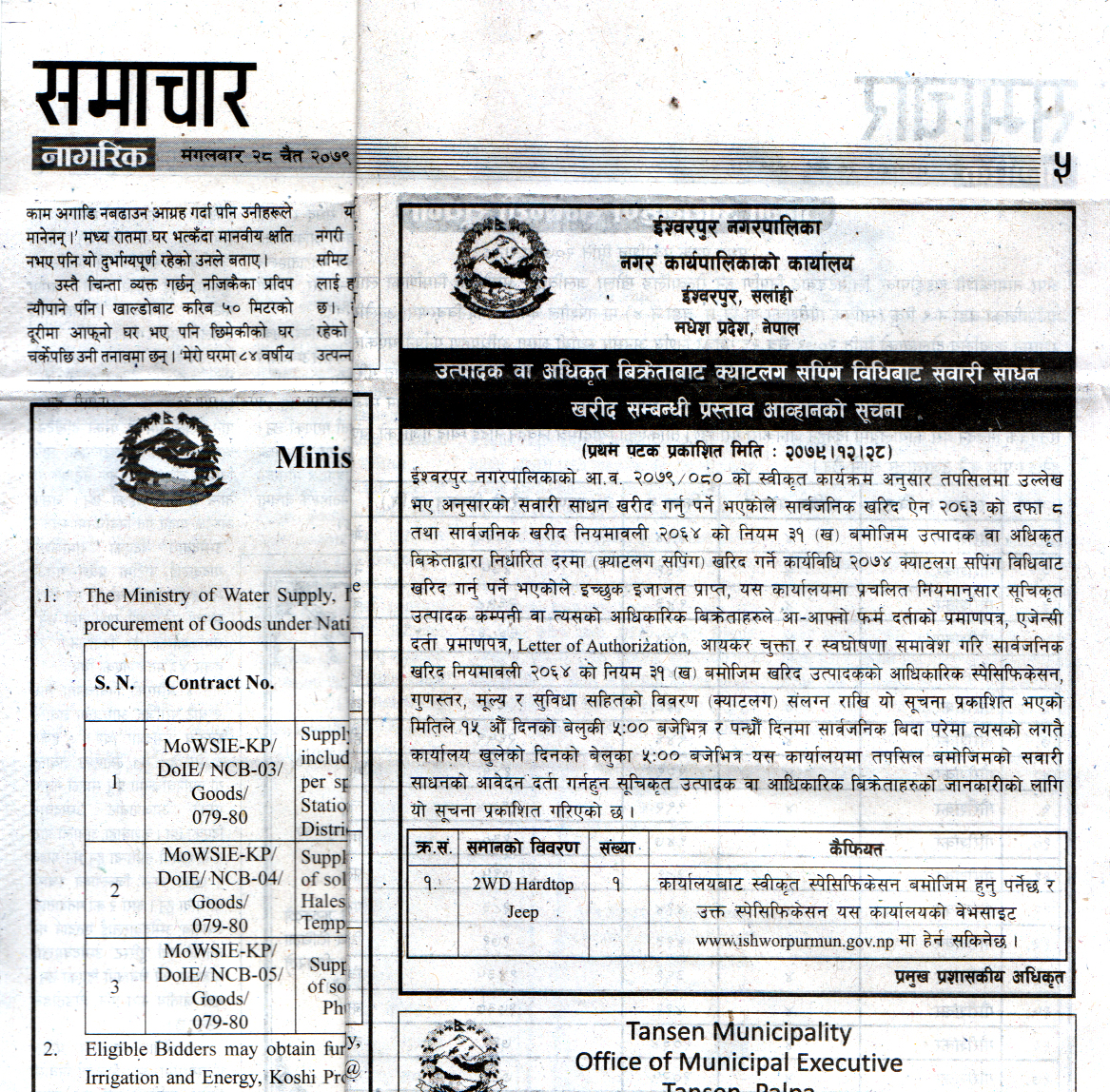 » उत्पादक वा अधिकृत बिक्रेताबाट क्याटलग विधिबाट सवारी साधन खरीद सम्बन्धि प्रस्ताव आह्वानको सुचना