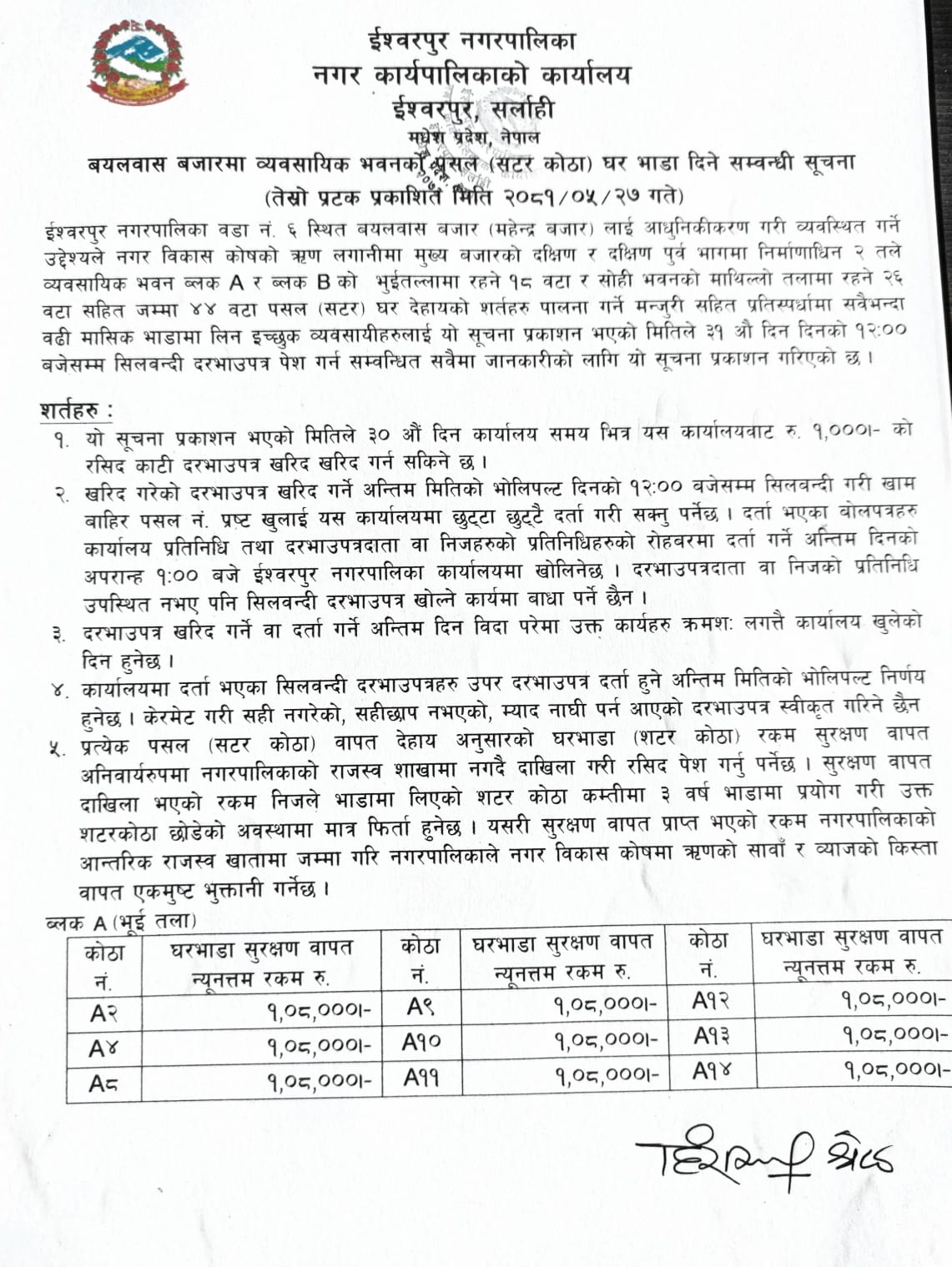 बयलवास बजारमा व्यवसायिक पसल (सटर कोठा) घर भाडा दिने सम्वन्धी सूचना